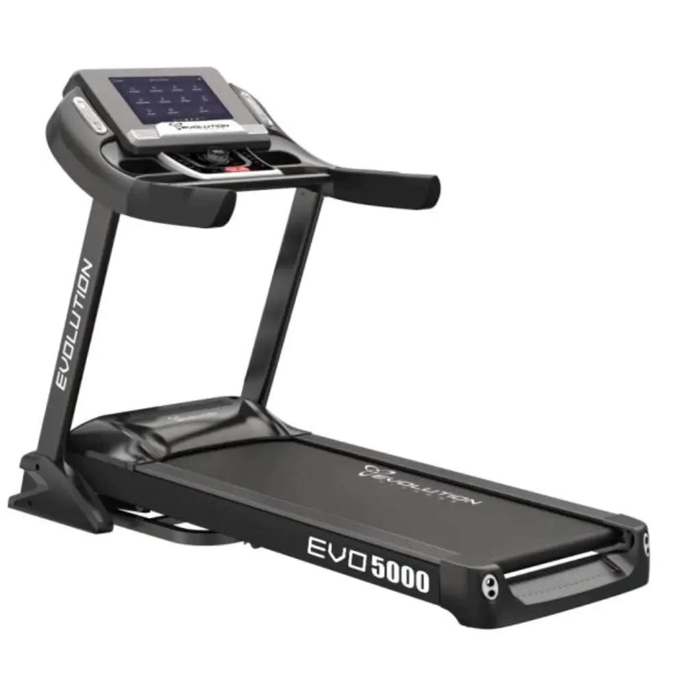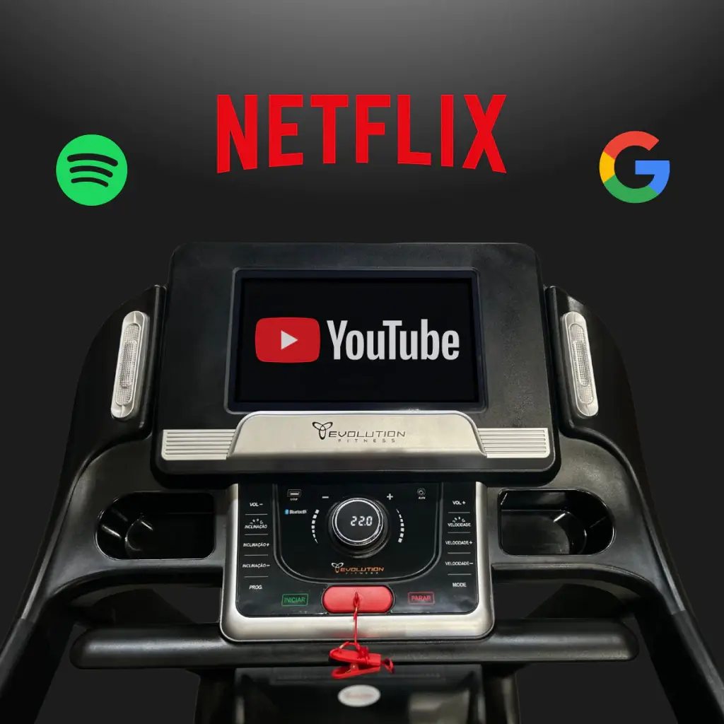 A EVO 5000 vem com um painel de 15,6″ Touch Screen com sistema Bluetooth e autofalantes, e 12 programas de treino pré-setados. A aferição dos batimentos cardíacos é feita via hand pulse e o equipamento possui 3 porta-objetos para sua conveniência.